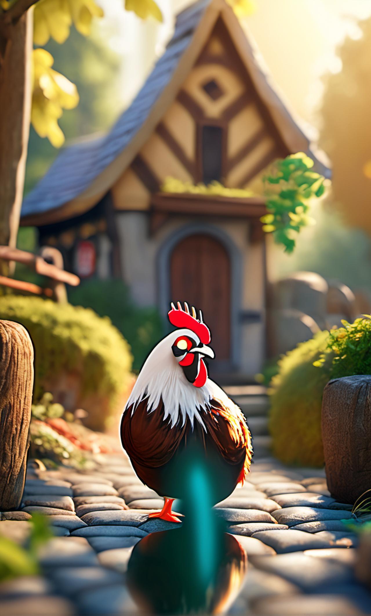 它的眼睛可能闪烁着异常的光芒,透露出一种超越普通家禽的智慧和灵性。鸡神的冠子和肉垂可能比普通鸡更加醒目,甚至带有一种淡淡的魔法光泽。