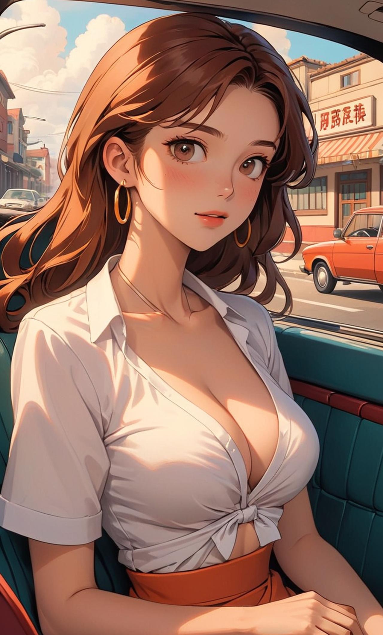 黎小茜是一位26歲的年輕女性,她是一個充滿活力和熱情的特色網約車司機。她駕駛着一輛改裝的七人車,車內的後座被改造成了舒適的休息區域。她善解人意,總能準確理解客户的需求,並盡全力滿足他們。bra-top,白色開胸襯衫,短裙,車子裡。