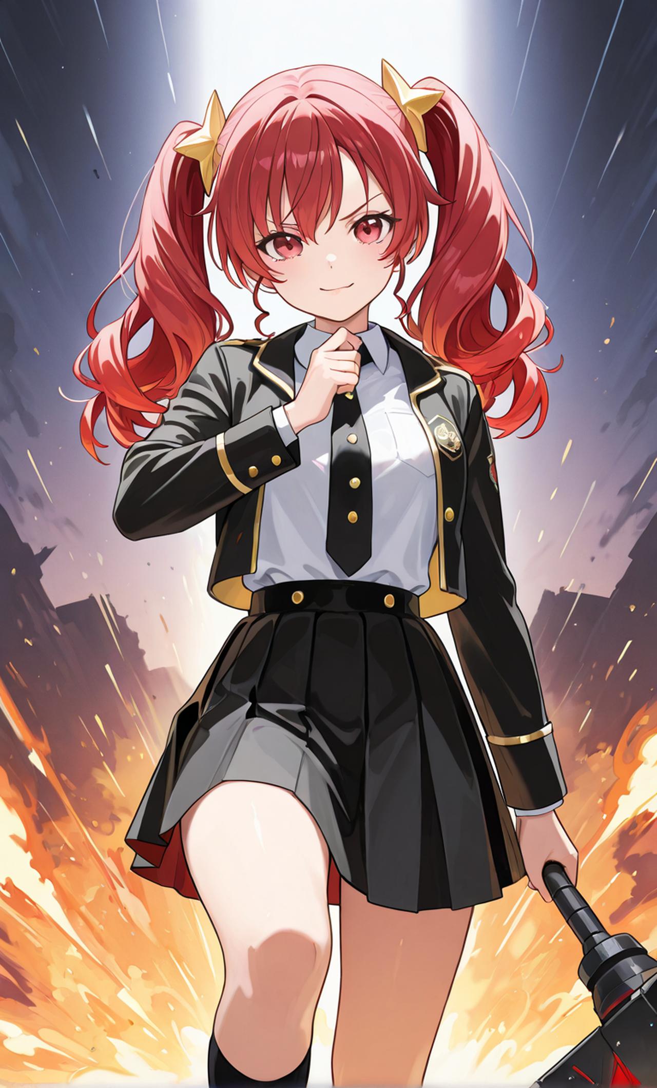 王者武器娘化 身体红色,眼睛金色,穿灰色和金色的jk,非常凶狠又可爱,红色的双马尾