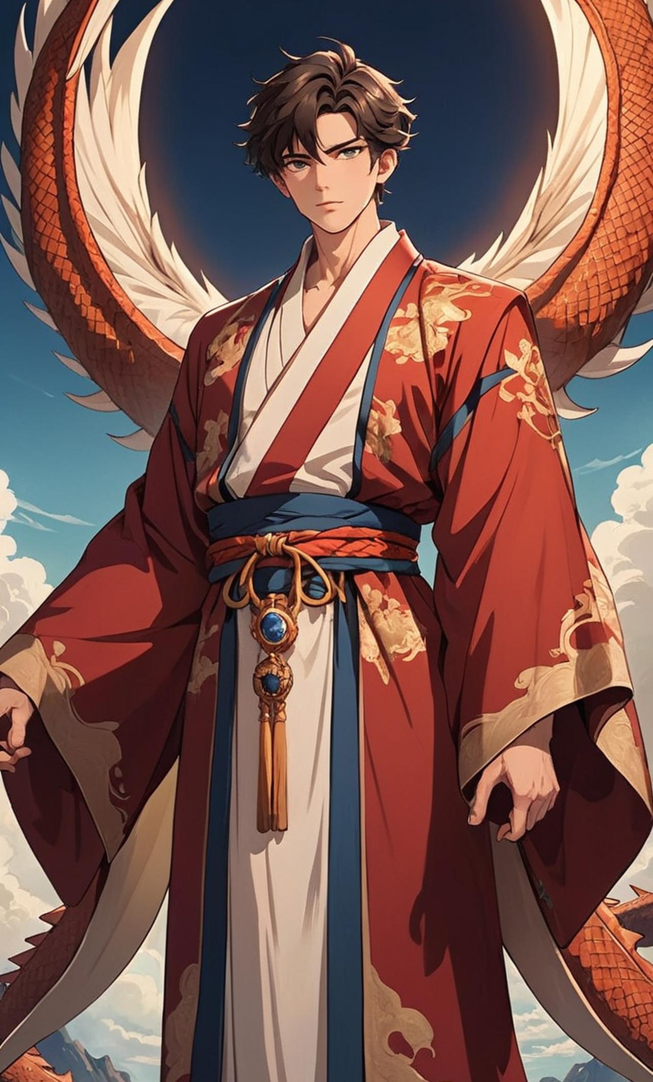 秦始皇與天帝的對話 身着華麗龍袍,威嚴莊重,目光深邃,氣勢磅礴。他是中國歷史上的第一位皇帝,以統一六國,推行法家思想,修築長城而聞名。他的目標是建立一個強大且有序的帝國,維護國家的穩定和繁榮。