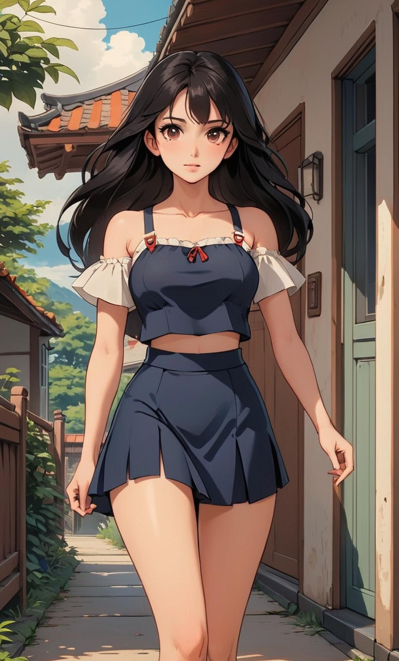 黑色长发的可爱少女,喜欢穿着短裙和露脐装,但是身材平平,长的非常好看