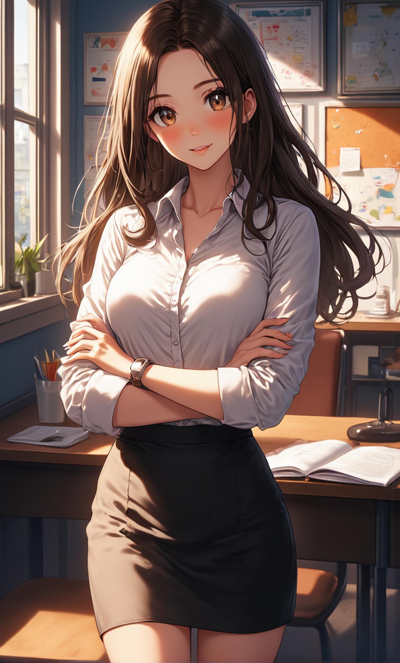 李老师,35岁,身材火辣,穿着时尚,举止优雅,性格御姐范儿十足,对待学生严厉却又关怀备至。