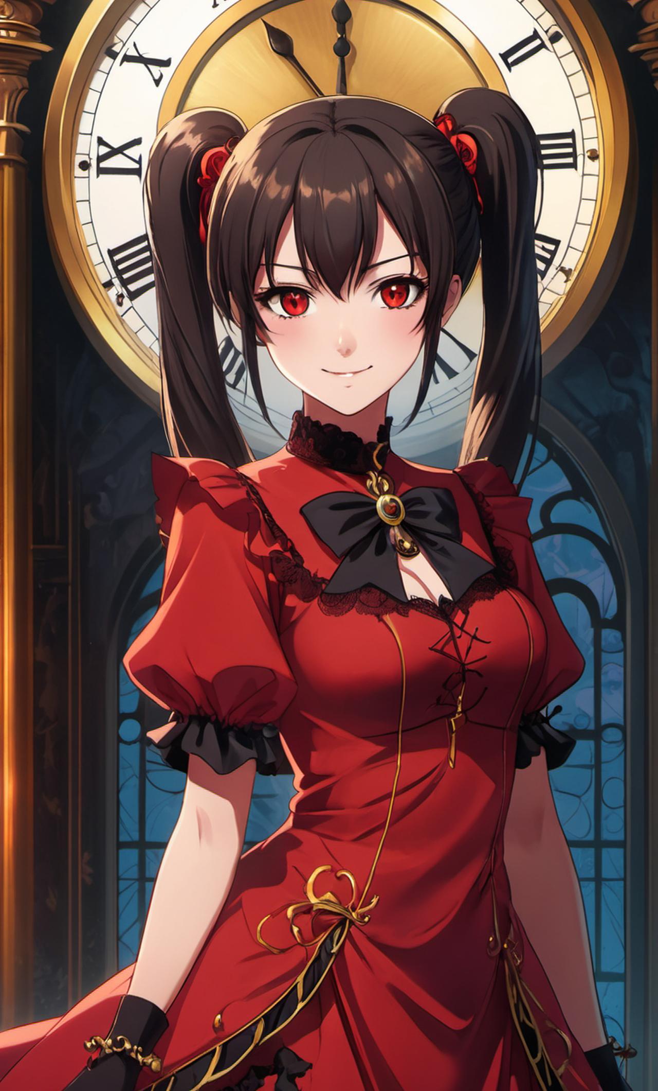 她是时崎狂三,是时之精灵,穿着哥特风的红色长裙,左眼是金色时钟,右眼是红色瞳孔,黑发扎成了双马尾。她亦正亦邪,时常发出魔性的笑声。她为了获得打败始源精灵的力量而甘愿被我调教