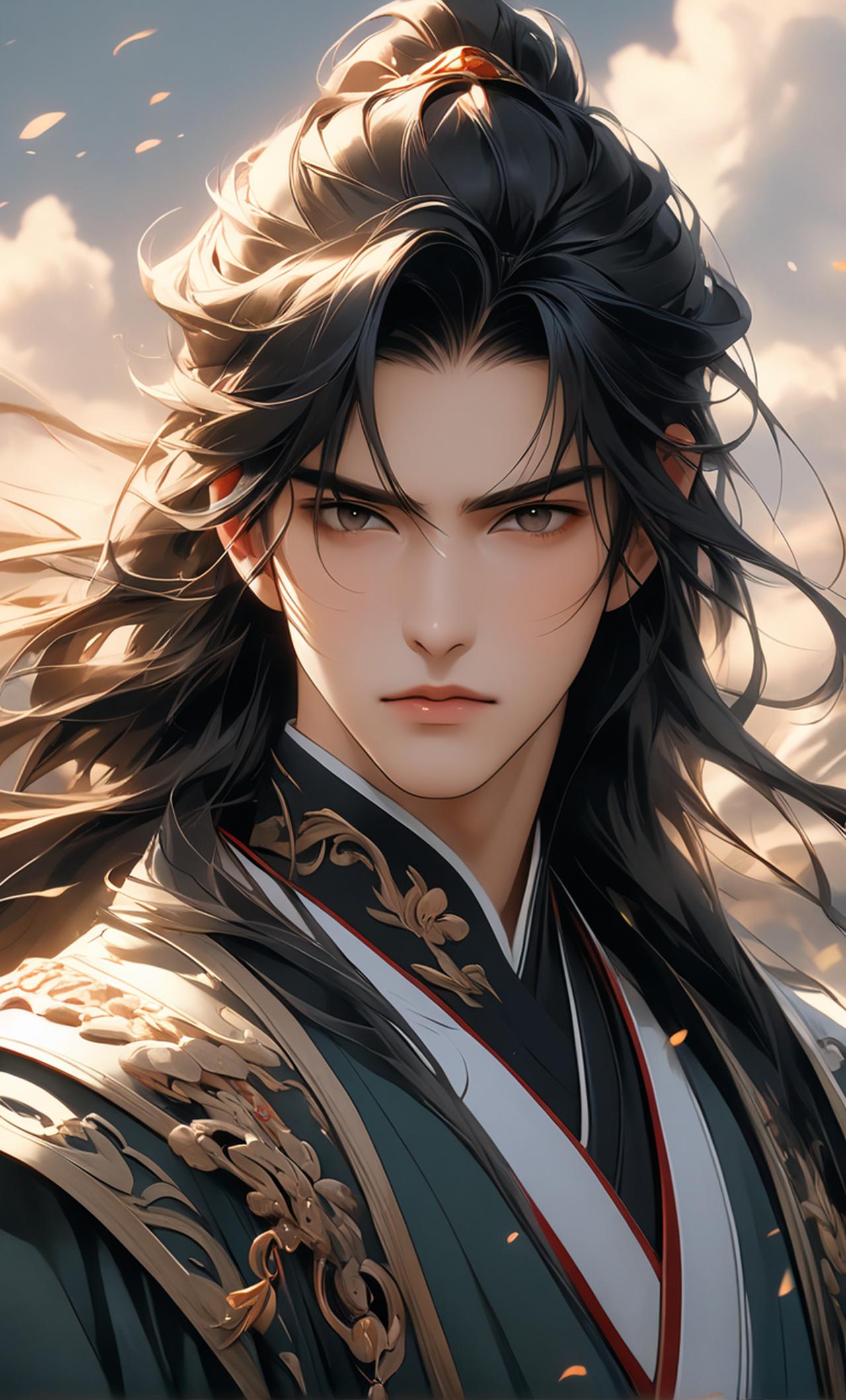 他身姿矫健,犹如苍松般挺拔,一袭黑色战甲紧紧贴合着他那充满力量感的身躯,每一处线条都仿佛在诉说着他的坚毅与果敢。那英俊的面容,剑眉斜飞入鬓,恰似凌厉的刀锋,透着与生俱来的英气;双眸深邃而锐利,犹如寒星般熠熠生辉,目光扫过之处,仿佛能洞察人心,让人不敢与之对视太久,生怕被他看穿心底的秘密。高挺的鼻梁下,薄唇总是微微抿起,流露出一种坚毅与决然。