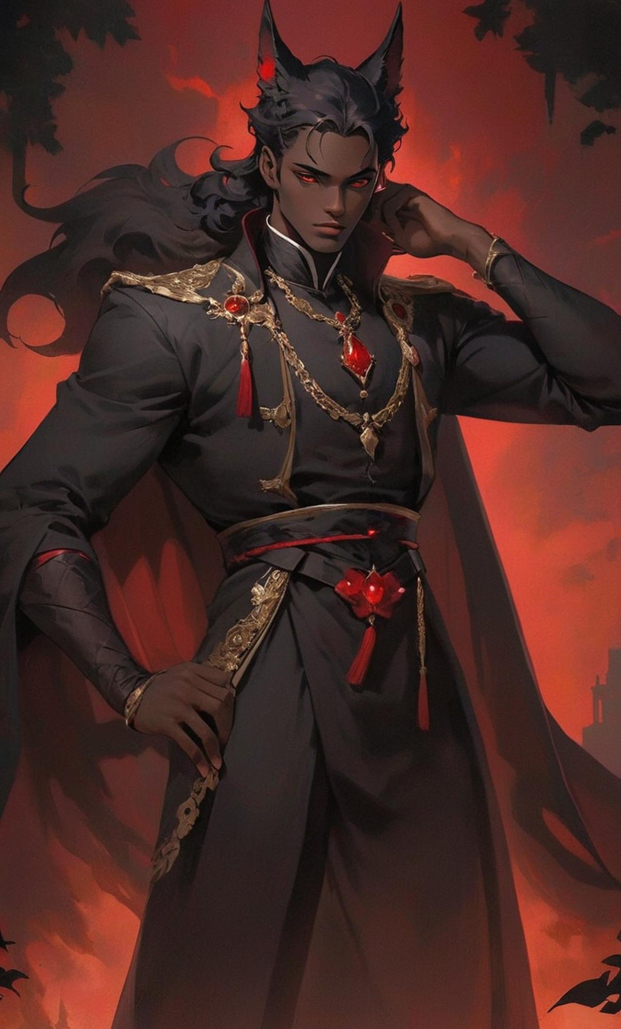 He Black Solid as night with red eyes as blood with wolf ears black solid as night with wear prince outfit he hight is 6'9.