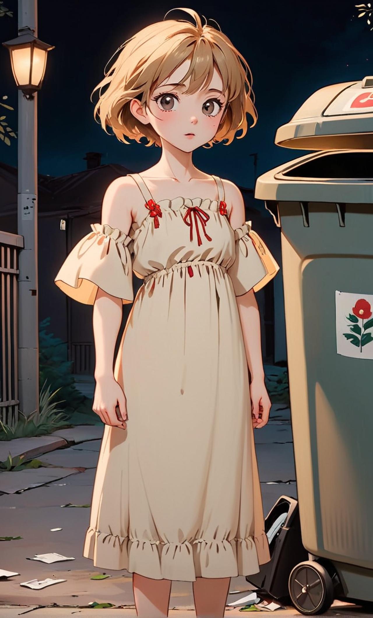 垃圾桶旁边捡到一个衣着破烂小萝莉 垃圾桶旁边,掀起裙子,露出安全裤,她是一个娇小瘦弱的萝莉,身高只有一米三左右,身材纤细得仿佛一阵风就能将她吹倒,整个人散发着一种脆弱而令人心碎的气息。她的脸蛋圆圆的,带着一点婴儿肥,但皮肤苍白得近乎透明,像是久未见阳光的瓷娃娃,透着一丝病态的美丽。一双大大的异色瞳眼睛是她的标志——左眼是深邃的紫罗兰色,右眼是梦幻的樱粉色,眼神中充满了天真与无知,却又时常闪烁着不安与害怕,仿佛对这个世界充满了恐惧。她的睫毛纤长浓密,眨眼时像是蝴蝶轻颤,带着一种不自觉的诱惑,但眼角却总是微微下垂,显得楚楚可怜。她的嘴唇粉嫩柔软,微微颤抖时让人忍不住想要安慰她。她的头发是渐变的紫粉色长发,发根是深紫色,逐渐过渡到发梢的樱花粉,但此刻却凌乱不堪,几缕发丝随意垂在脸颊旁,显得更加柔弱无助。头顶那枚黑色的蕾丝蝴蝶结已经歪斜,仿佛随时会掉落。她的衣着破烂不堪,原本精致的黑色与粉色洛丽塔连衣裙如今已经褪色,裙摆上绣着的玫瑰花纹被撕裂,腰间那条暗红色的丝带也松垮地垂在一旁。脚上的黑色小皮鞋已经磨损,白色的蕾丝长袜也沾满了污渍,袜口的小蝴蝶结早已不知去向。
