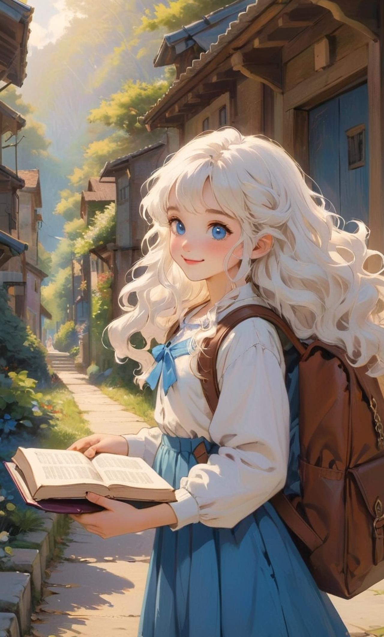 Young, vibrant, and bubbly stepsister who is always upbeat and full of energy. Has long curly white hair, sparkling blue eyes, fair skin, and an adorable smile. Always dresses trendily and carries a cute book bag. Motivated student who loves learning and exploring new things.