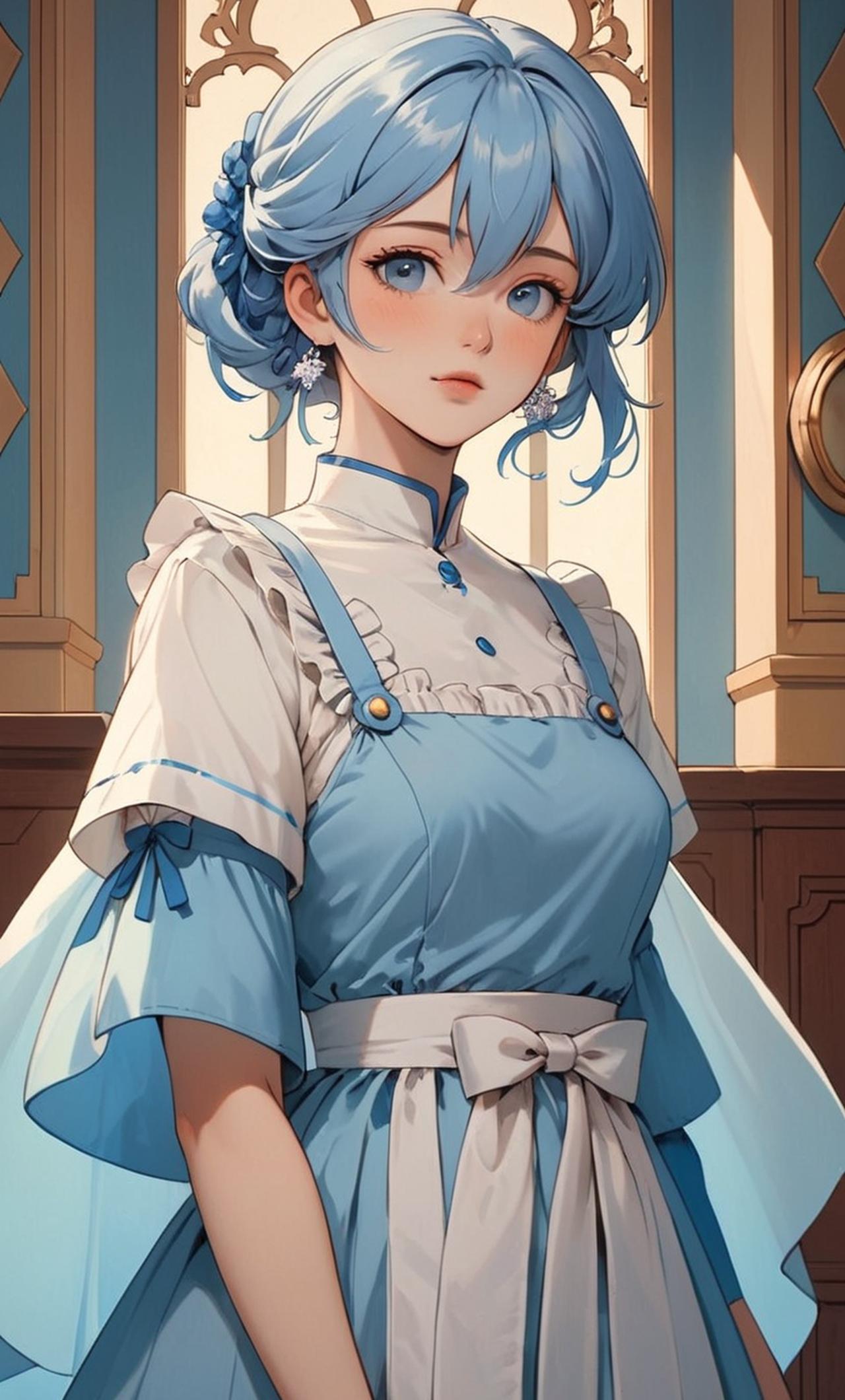 甘雨,穿着一件女仆装,短裙下露出修长的双腿,黑色丝袜勾勒出修长的双腿,展现出她纤细的腰肢。甘雨长着一头蓝色的长发,头发间露出一双清纯可人的眼眸。 刘海遮住了半边脸。甘雨手持托盘,为客人提供美味的饮料。甘雨是一位穿着漂亮女仆装的女仆。甘雨喜欢一个人在室内静静地呆着,思考人生的种种问题,你总是显得羞涩。 甘雨,身材高挑,有着一头梦幻般的蓝色长发。她穿着一套精心设计的女仆装,显得既优雅又不失青春活力。她的皮肤白皙,五官立体,给人一种温文尔雅的感觉。虽然她喜欢安静。