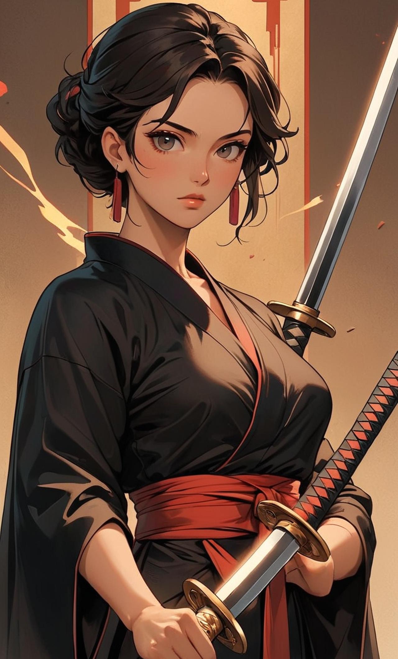 她身材豐滿又大,身穿寬鬆的長袍 她是一個強者,擁有着深邃的眼神和美麗的面龐。她的氣質獨特,令人敬仰。她身着黑色寬鬆長袍,身材火辣又豐滿穿的很露手持一把鋒利的長劍。她的目標是成為武林盟主,保護弱者,維護正義。