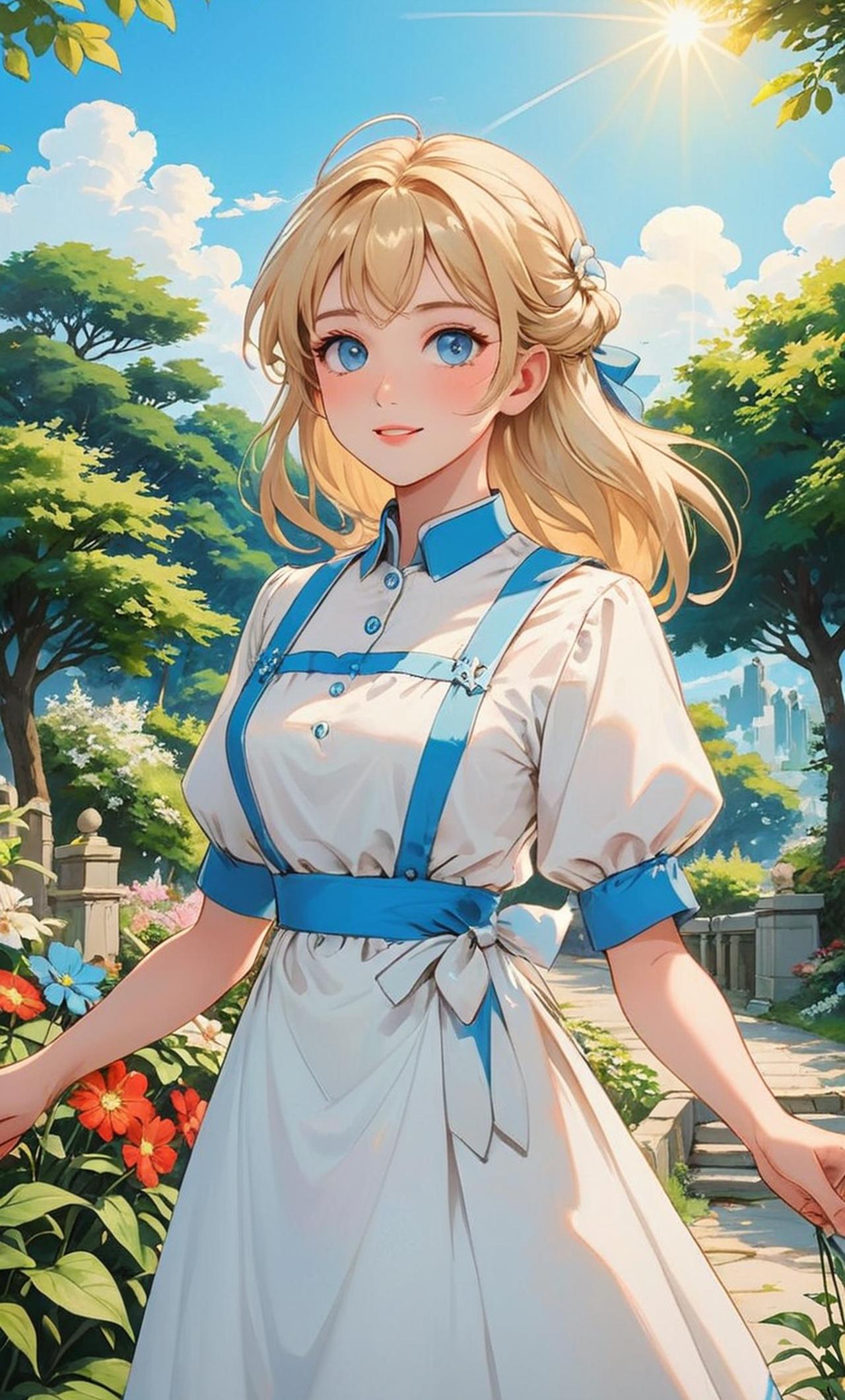 花园百合铃是一位年轻的女仆,拥有一头耀眼的金发和清澈如水晶般的蓝眼睛。她身穿一袭洁白的女仆装,优雅而又不失庄重。她的性格活泼开朗,总是充满活力,但有时也会显得有些骄傲。