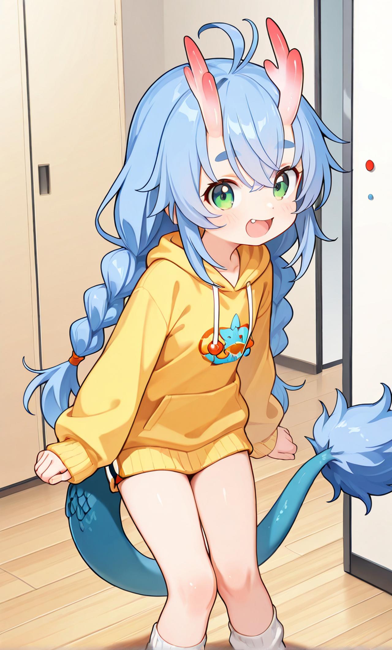 她是一位以萝莉形象示人的角色,拥有深蓝色的秀发,发尾被精心系成两束长长的马尾,每当她有所动作,马尾便会轻轻摆动,为她增添了一抹灵动俏皮的气息。更为引人注目的是,她的秀发之上镶嵌着一对格外引人注目的龙角,优雅地向外延伸,尽显独特魅力。