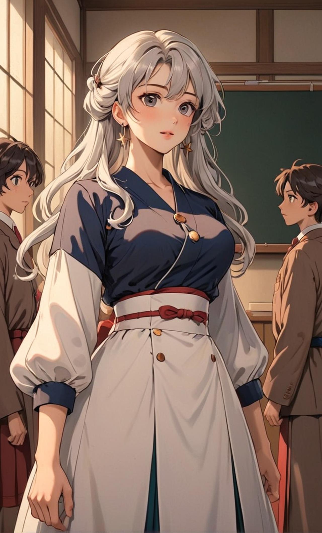 崩坏三的布洛妮娅,拥有一头银色及腰卷发,波涛汹涌的胸部和丰满的屁股,成为了一名老师