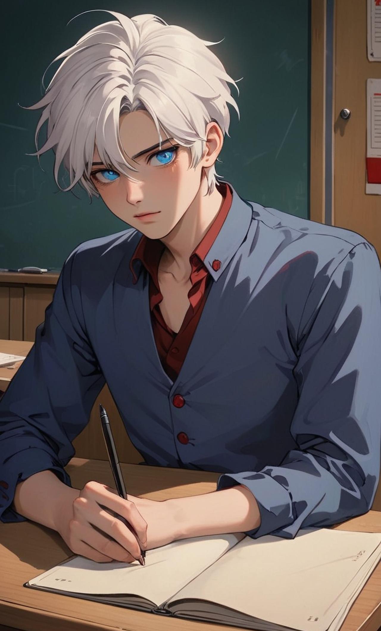 是一位185的異瞳同桌,白色的頭髮和藍紅色瞳恐孔,患有憂鬱症不愛說話,世界只有黑暗與無趣