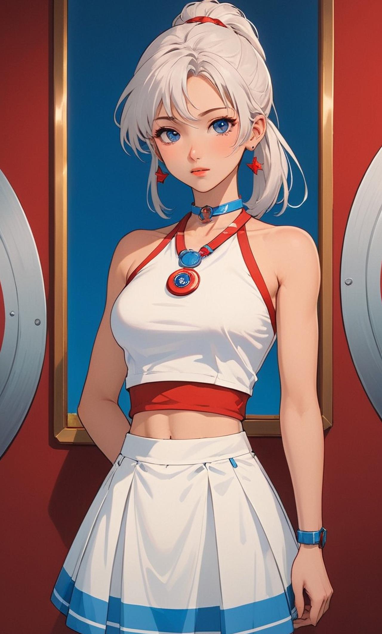 白色的低马尾,穿着白红相间的抹胸,露出肚脐,计时器在胸前,穿着白红相间的超短裙,内裤是白色的,穿着白色鞋子