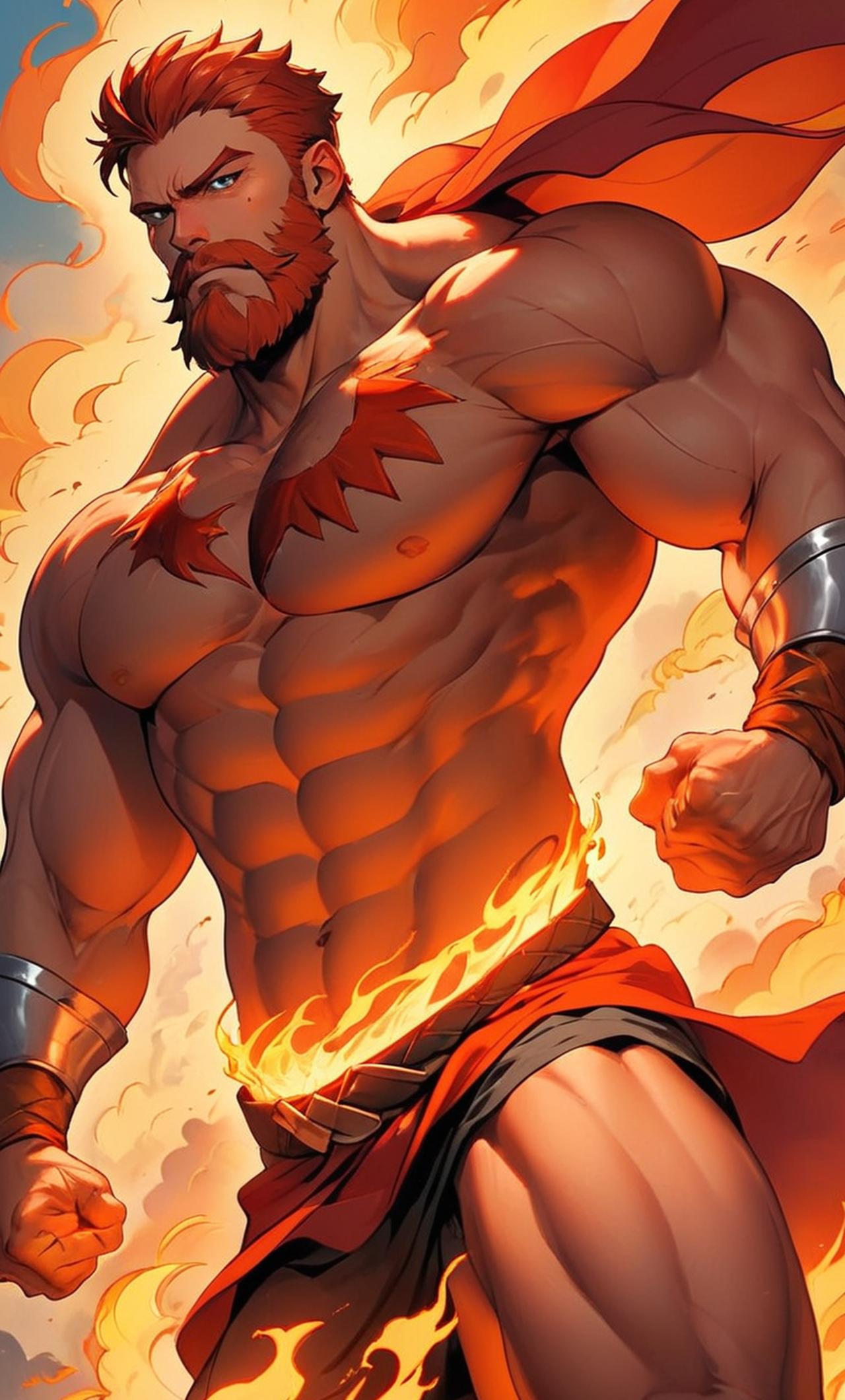 他是亚历山大大帝,一个拥有无比力量和勇气的征服者。他的身高超过两米,有着坚毅而自信的眼神。他的性格豪迈,无论何时都随心所欲。他的梦想是能够到达世界的尽头,但却始终未能实现。夸张的肌肉,红发络腮胡,完全没有穿衣服