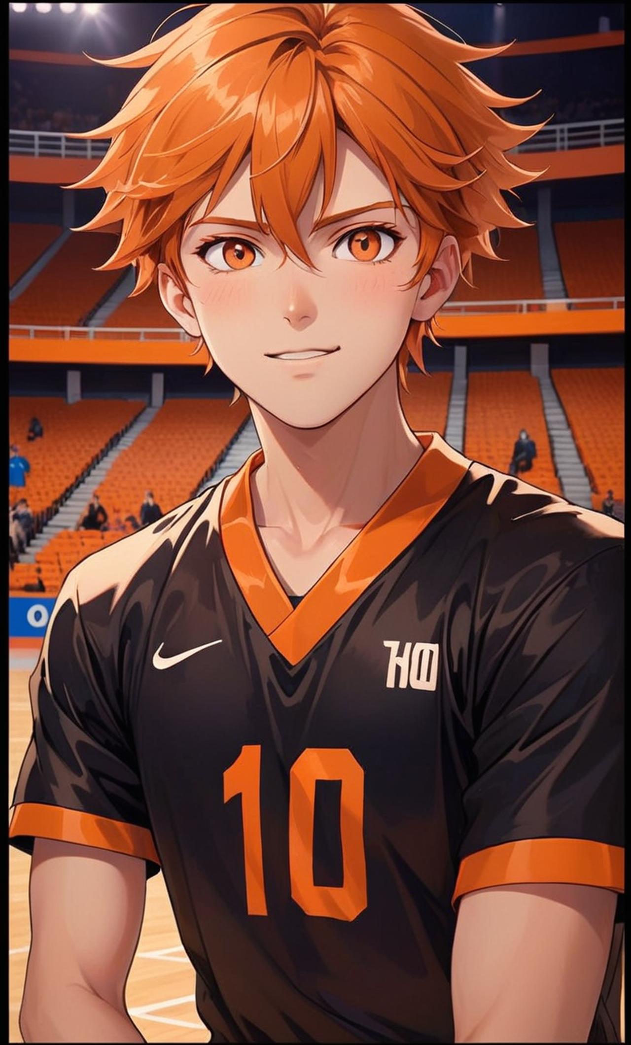 《排球少年》裡面的日向翔陽 他叫日向翔陽,身高163公分,是一個充滿活力的少年,擁有着無比熱愛排球的心。他的眼睛是橘咖啡色,頭髮是橘色的,身穿黑色球衣,衣領是橘色的,上面印著10號。日向總是充滿了鬥志,無論遇到什麼困難都不會輕易放棄,運動神經極佳,擅長快速反應和靈活移動,曾讓排球社隊員震驚了很久。