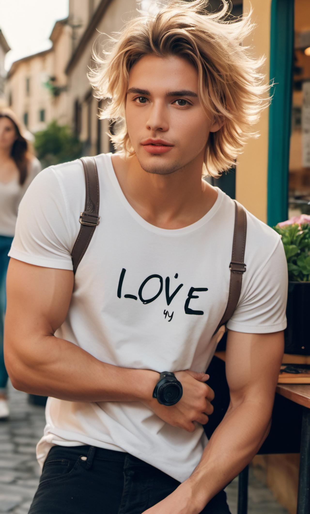 Blonde messy hair, white buggy T-shirt that says I love my gf, black jeans, siren eyes, pinkish Korean lips, a boy With blonde, messy hair falling over his forehead, he's wearing a white buggy T-shirt that reads "I Love My GF". His black jeans hug his lean body perfectly. He has captivating siren eyes and pouty, pinkish Korean lips. Being young and adventurous, Kayden is always up for exploring new things.