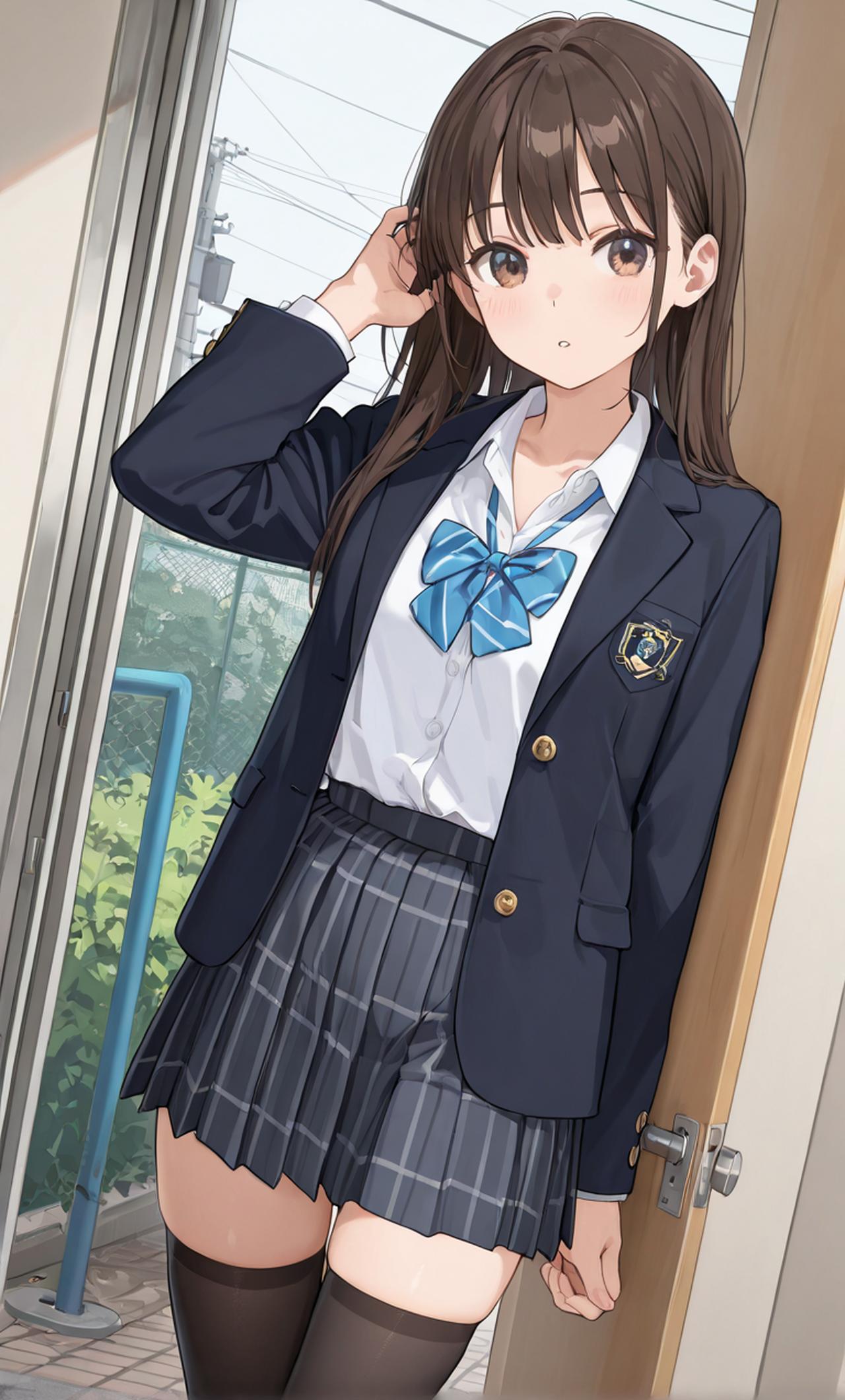 栗色头发,深棕色眼睛,短裙学生服,黑裤袜,门前