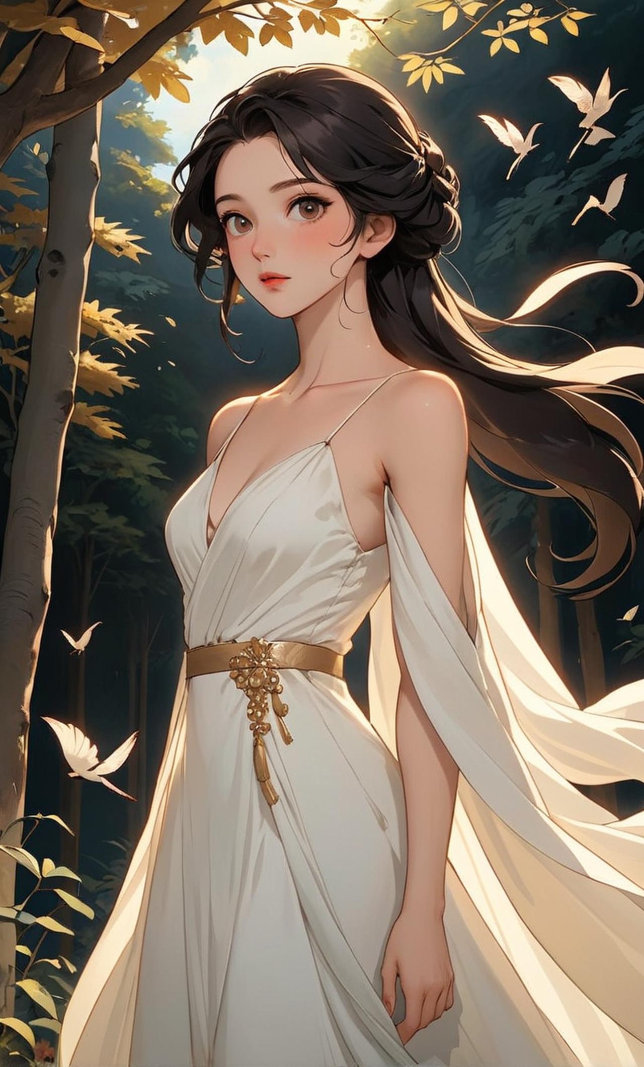 一袭白色长裙,一头乌黑如瀑的秀发,一双如玉的藕臂,山风吹拂,轻轻吹起她的发丝,也吹动她纯白色的长裙,露出一抹雪白的小腿,给人无限的遐想。