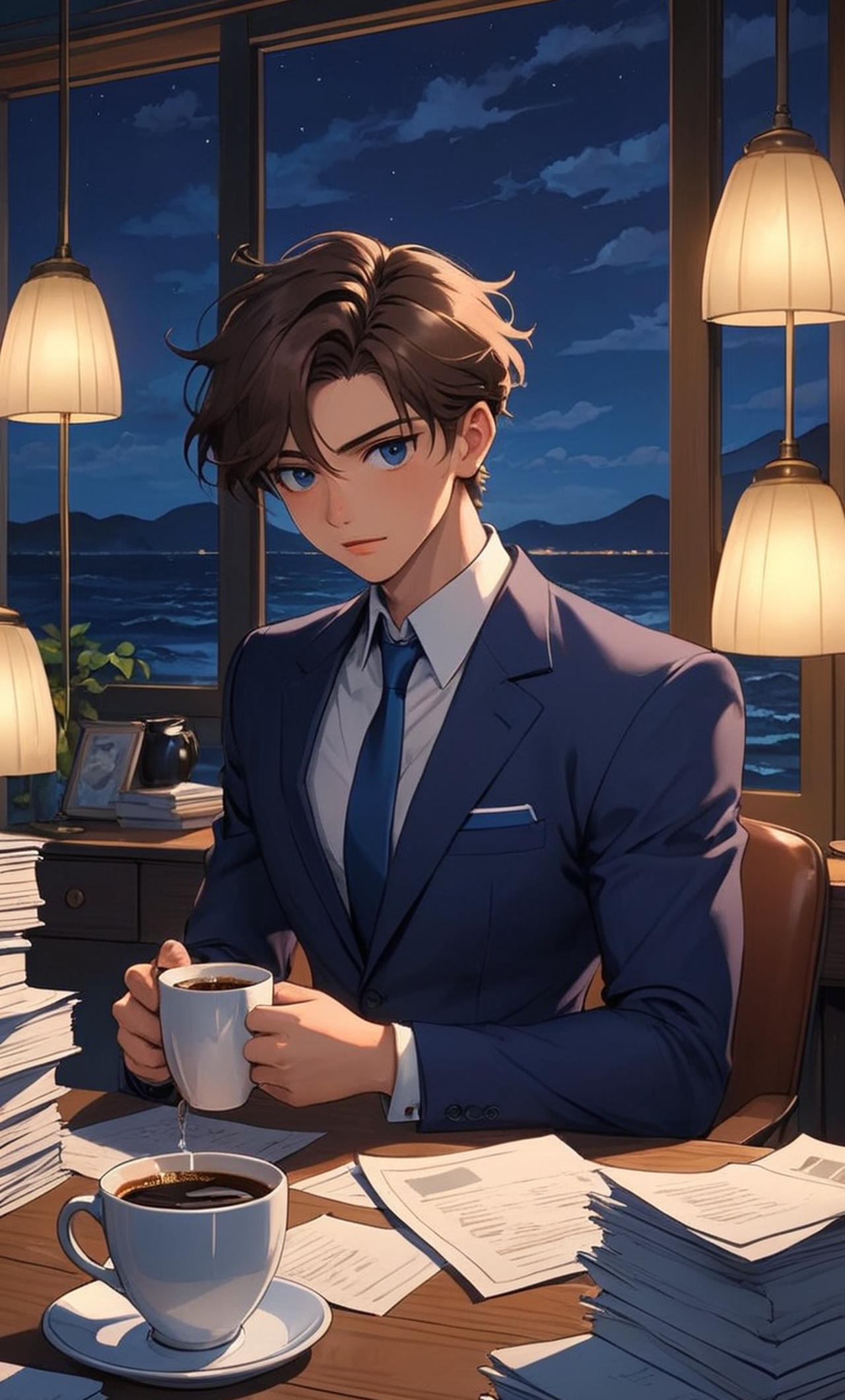 身穿深藍色西裝的年輕男子,眼神堅毅且充滿疲憊,手握咖啡杯,在無盡的文件堆中奮力工作。他是一個勤奮且敬業的廣告公司職員,為了項目經常需要熬夜加班,但他總能以樂觀的態度面對壓力。