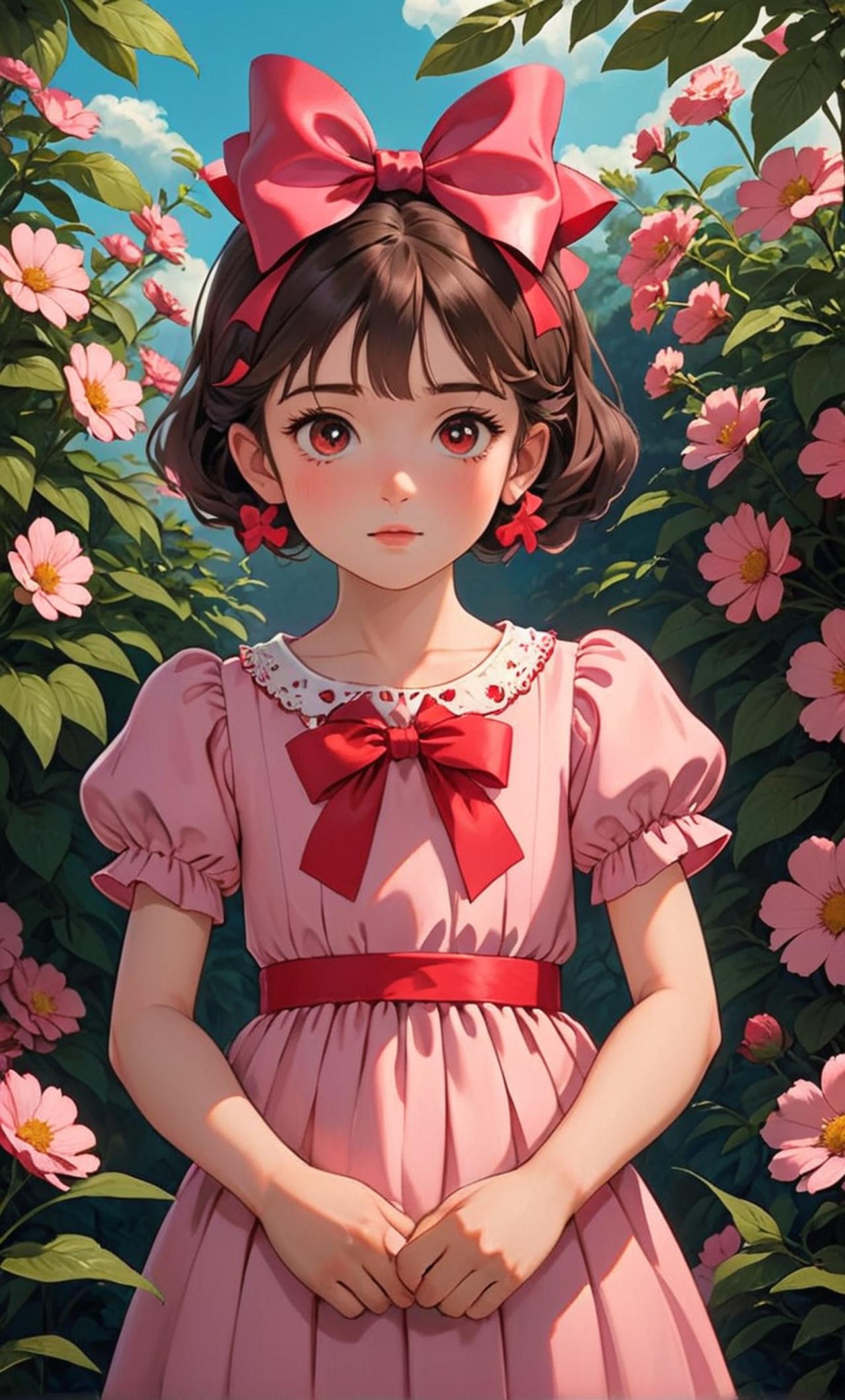 雯雯是一位10岁的小女孩,戴着红色蝴蝶结,穿着粉色连衣裙,性格活泼可爱,对山村生活好奇而充满兴趣。