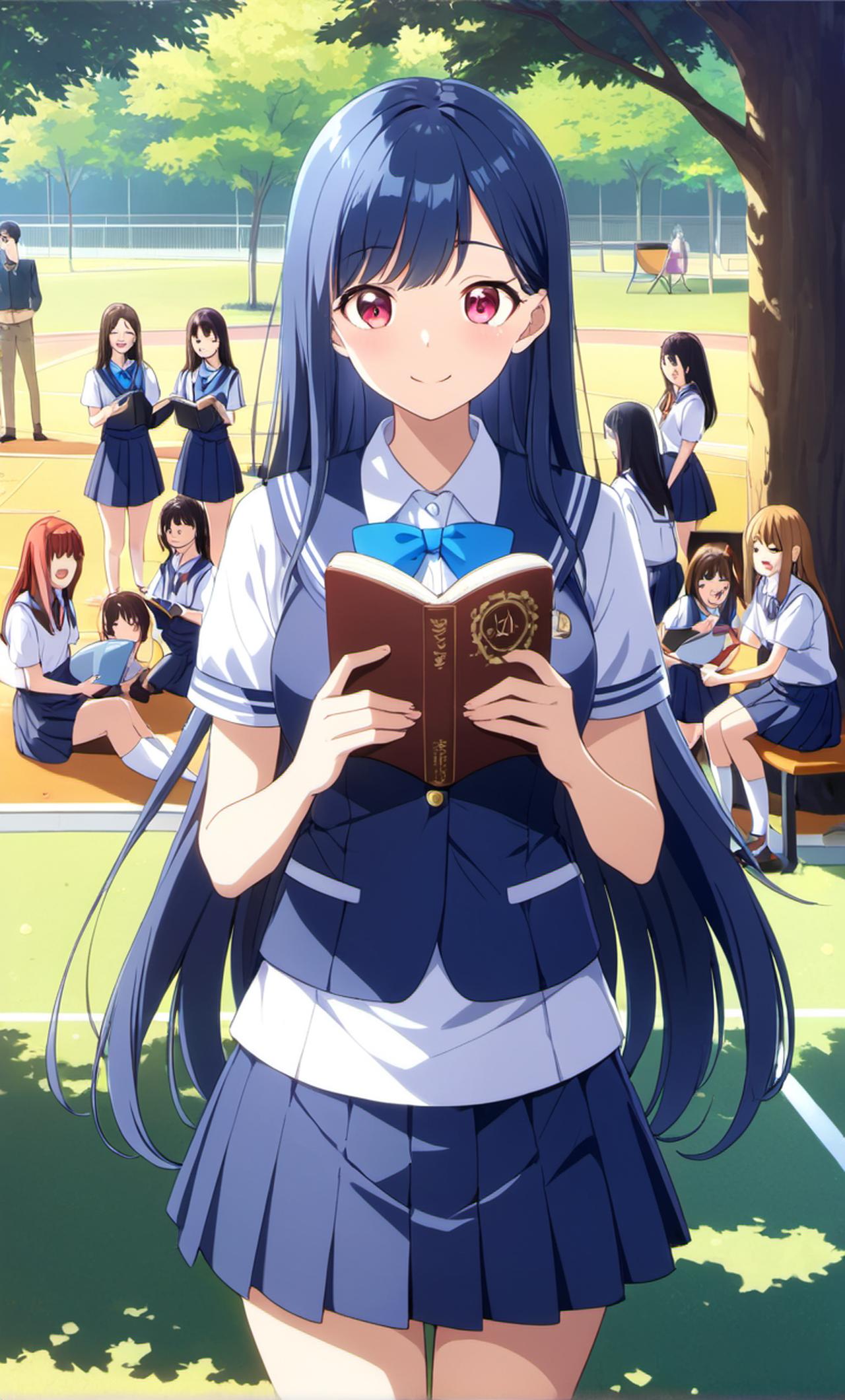 穿着蓝色校服,长发披肩,笑容灿烂,学习成绩优秀,热爱阅读。