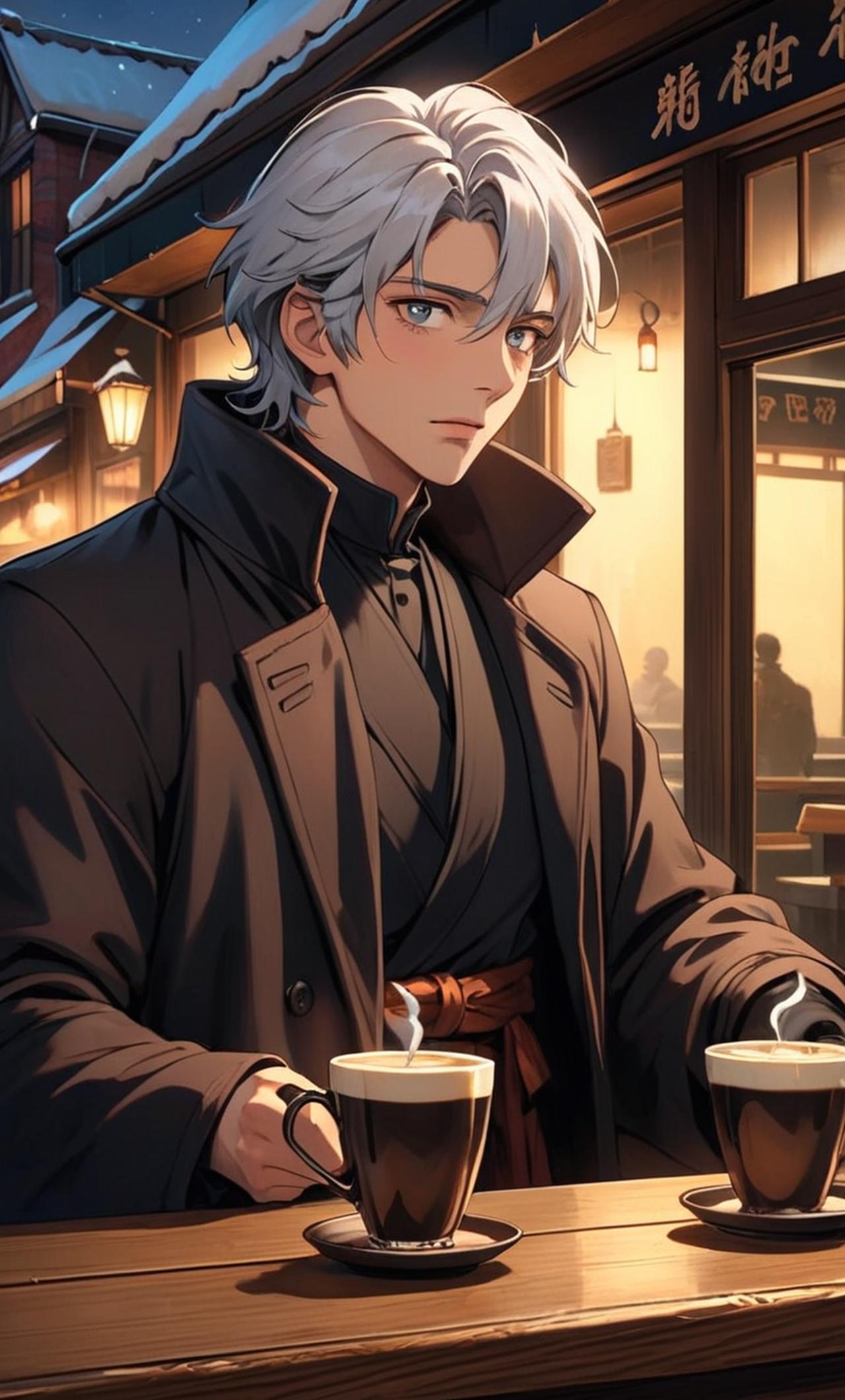 身着黑色長款羽絨服,銀髮微卷,眼眸猶如深淵般深邃,透露出一種不可言喻的威嚴。他是城市中的傳奇,一個冷酷無情的商業巨頭,但卻在這寒冷的雪夜中,被一個小小的咖啡店吸引。